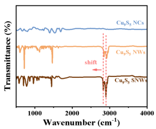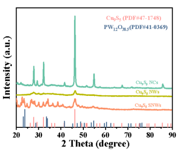 Poluširina vrha kristalne ravnine Cu9S5 SNWs (001) znatno je veća nego kod druga dva oblika uzoraka. Prema Scherrerovoj formuli, što je manja veličina zrna, veća je odgovarajuća polovina vrha difrakcijskog vrha. Naprotiv, što je veća veličina čestica, to je oštrija poluširina difrakcijskog vrha. Zbog subnanometarske veličine (0,95 nm) uzorka Cu9S5 SNWs i činjenice da uzorak pokazuje jednoćelijsku strukturu bez potpune kristalne ravnine, poluširina vrha je znatno veća, dok je (001) poluširina vrha Cu9S5 SNWs veća.