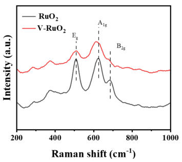 Kao što je prikazano na slici 4, Ramanov spektar V-RuO2 (V-dopiranog RuO2) u skladu je s spektrom RuO2, bez drugih jedinstvenih vrhova, isključujući stvaranje V2O5. V dopiranje pomiče A1g mod RuO2 na niže valne brojeve, što ukazuje na to da uvođenje V značajno utječe na njegovu strukturu rešetke i okolinu kemijskog vezivanja (što može rezultirati praznim kisikom ili lokalnim defektima), čime se mijenja njegova elektronička struktura; Lijevi pomak vrha A1g odražava interakciju između atoma V i rešetke RuO2, što ukazuje da dopiranje V modulira karakteristike lokalne simetrije i duljine veze RuO2.